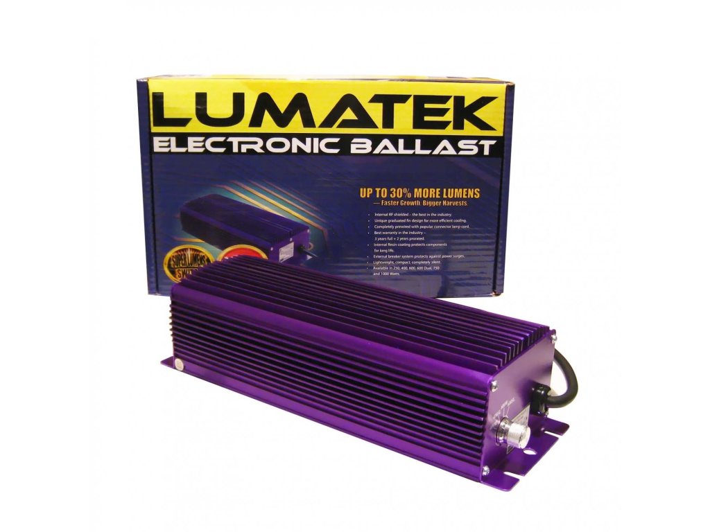 Společnost Lumatek používá nejkvalitnější elektronické součástky, čímž zajišťuje delší životnost lamp s minimální ztrátou výkonu PAR / PPF v průběhu času. Tyto ztráty jsou dramaticky nižší než u tradičních magnetických předřadníků. Předřadníky Lumatek umožňují připojení lamp HPS i MH (mějte prosím na paměti, že u lamp MH nelze použít spínač Super Lumens (SL)).