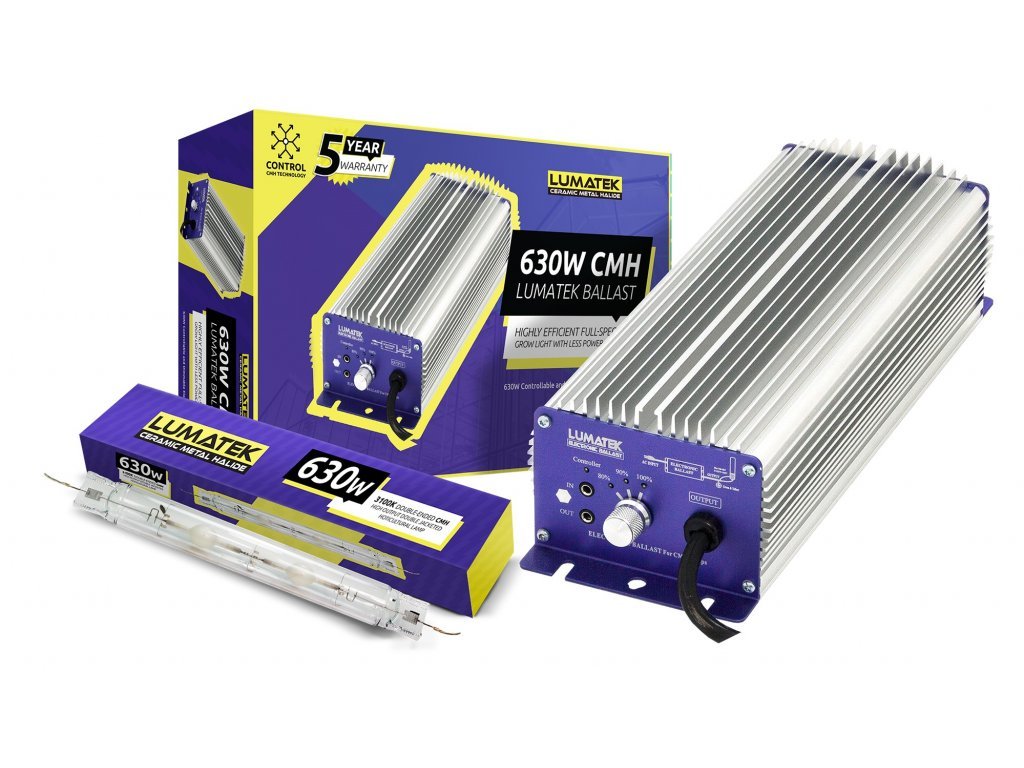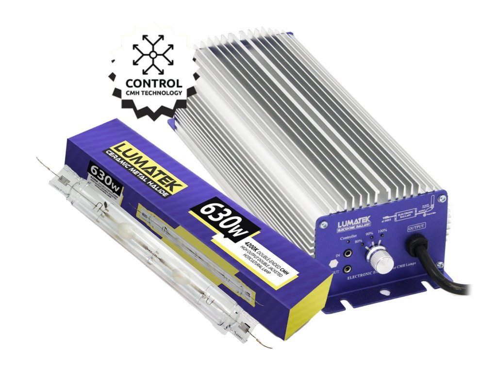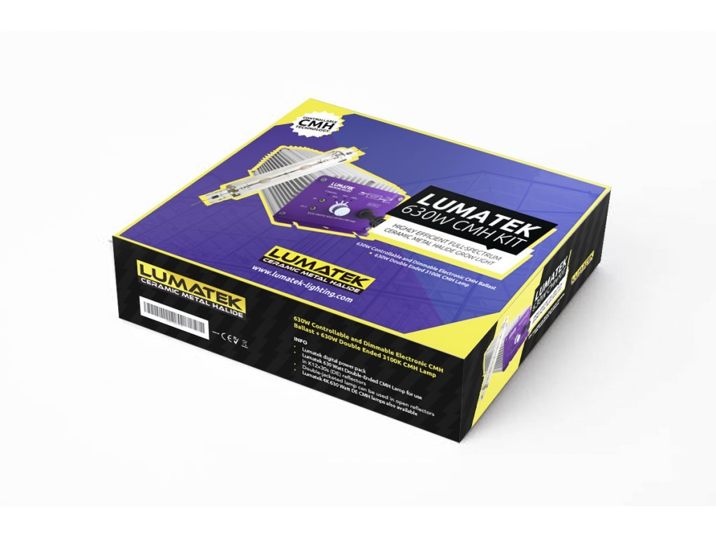 Technologie CMH vytváří vysoké energetické úrovně PAR / PPF v plném spektru, s nízkou emitací tepla, což je bližší slunečnímu záření a produkuje zdravější růst rostlin a větší výnos. S indexem CRI (Color Rendering Index)> 90% je CMH ideální pro pěstování vysoce kvalitních produktů a extrakci esenciálního oleje. Lumatek 630W Double-ended (DE) keramické metalhalogenidové výbojky (známé také jako CMH / CDM / LEC) jsou k dispozici ve formátech 4200K Daylight a 3100K Agro CCT.