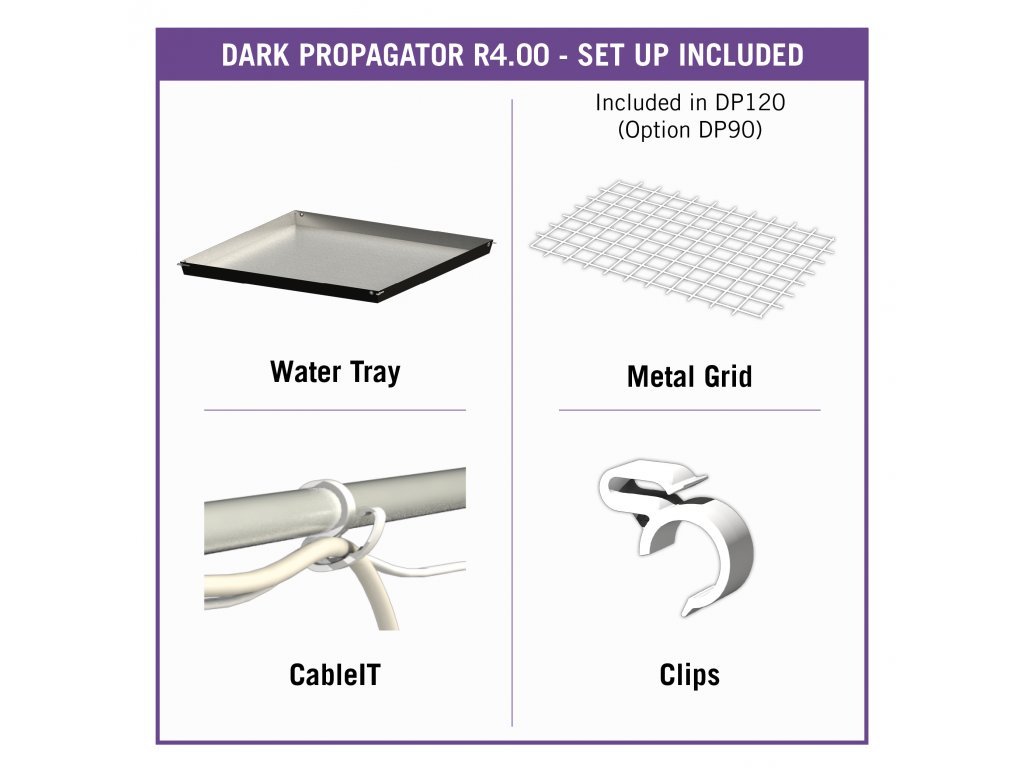 Součástí velkého Dark Propagator je 1x pár StrapIT (popruhy na filtr), 6x pár HookIT (háčky pro zavěšení světel) a 30x CableIT (klipsny na kabely). Propagační box je vybaven dvojitým dnem a disponuje dostatkem otvorů pro ventilaci (průměr 200mm) nebo kabeláž (průměr 75mm).