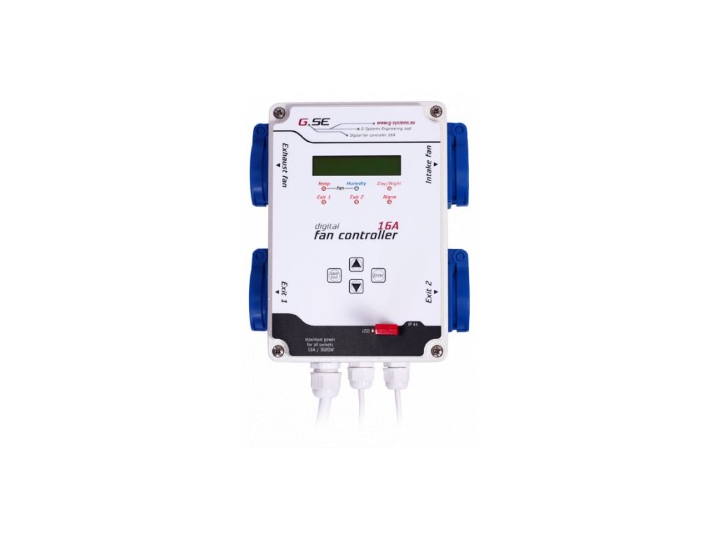 Digitálny regulátor Fan controller GSE, 16A/4x2200W je určený na dôkladnú kontrolu teploty a vlhkosti v uzavretom prostredí pomocou viacerých ventilátorov. Každá zásuvka zvládne max. príkon 2200W, celkový príkon na prístroj nesmie presiahnuť 3600W.