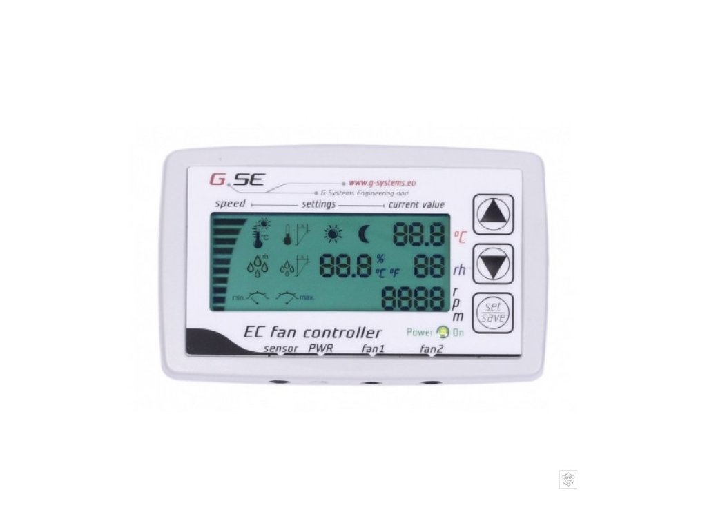 LCD EC regulátor umožňuje naprogramovať až 15 individuálnych nastavení pomocou iba troch tlačidiel. Zabudovaný svetelný senzor na sonde rozpozná režim deň a noc. Prístroj vrátane s napájacím metrovým káblom, 4m káblom so čidlom a ďalšie dva štvormetrové káble k ventilátoru vrátane 3,5mm jack. Tento regulátor je určený iba pre ventilátory s komutátorovým (EC) motorom. Regulácia v závislosti od teploty, vlhkosti, dennej fázy, hysterézie.