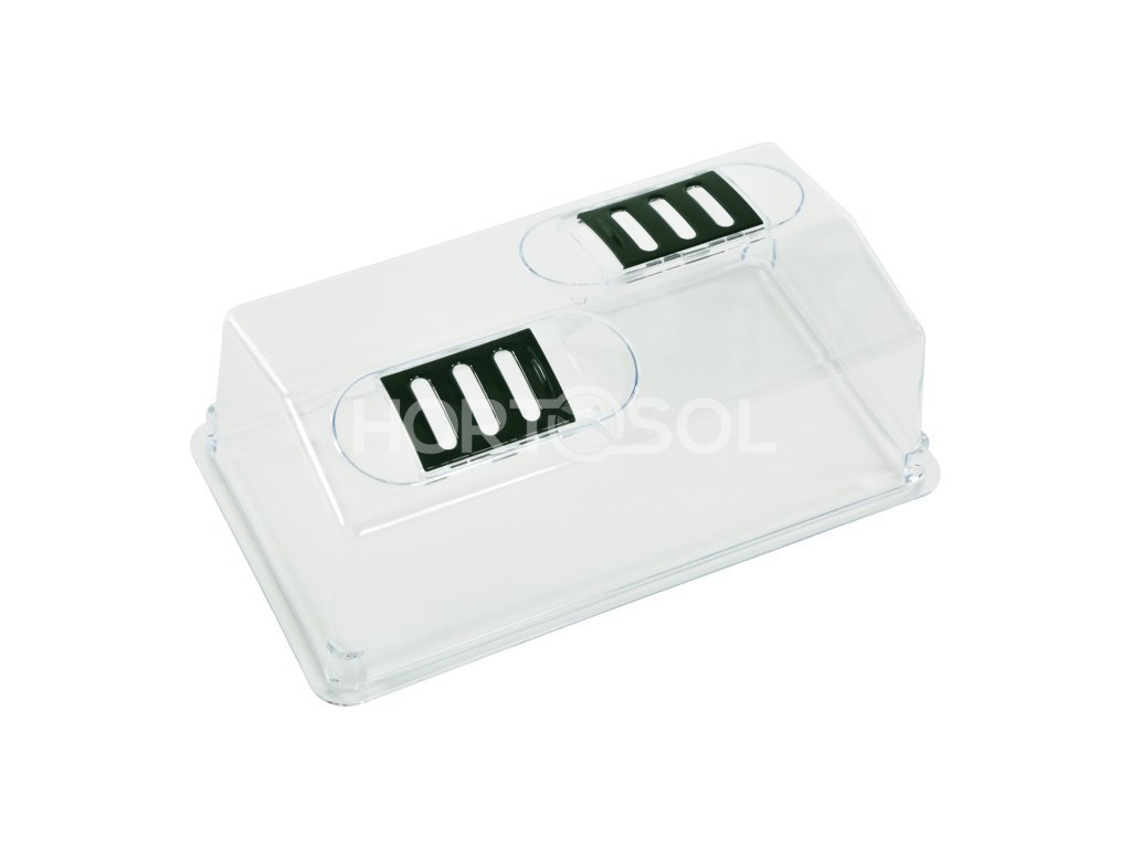 Veľký plastový skleníček pre vaše klíčenie a rast sadeníc. Skleníček je vyrobený z veľmi pevného a odolného plastu, ako spodná časť tak aj veko. Veko je opatrené reguláciou ventilácie. Ideálny rozmer pre celé plato sadbovacích kociek Grodan v sadbovači.